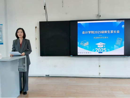首先由林冬梅院长讲话。她简要回顾了学院的发展历程与取得的成就,强调了学院始终秉持“立德树人”的根本任务,以培养高素质、复合型高技能财经人才为己任。她指出,在当前科技革命和产业变革的浪潮下,学院所设专业前景广阔,同学们的选择是富有远见的。林院长对家长提出了殷切期望:一是重视孩子学业进展和职业规划;二是鼓励孩子生活独立与自我管理;三是提供孩子情感支持与沟通交流;四是加强孩子价值引导与品格修炼。林院长特别强调了家庭教育的重要性。林院长表示,学生的成长成才需要学校、家庭、社会形成合力。她希望家长们能持续关心孩子的成长,多与孩子沟通,了解他们的思想动态;多与辅导员、老师联系,掌握其在学校的表现;多给予鼓励和支持,做孩子坚强的后盾。学院也将通过多种渠道与家长保持密切沟通,共同为学生的健康成长保驾护航。