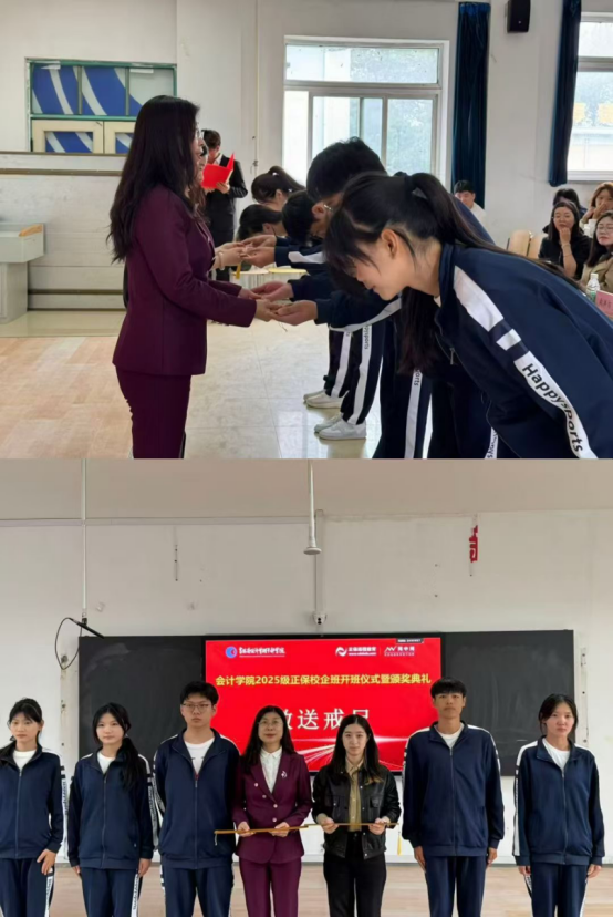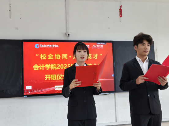 为以契约精神塑造新时代师徒标杆,开班仪式特别设置学生向师傅敬呈戒尺、躬身拜师的环节,彰显尊师重道与求学初心。2025级新生代表怀着对知识与技能传承的敬畏之心,郑重向会计学院党总支副书记赵金燕、正保网中网郭宜屺经理敬呈象征“师道威严、技艺传承”的戒尺。这一环节不仅是对“传帮带”优良传统的创新践行,更在产教协同育人的语境下,锚定了技能传承与职业素养培育的双重使命,为新生开启了“校园-企业”双导师引领的成长新征程,让契约精神与工匠精神在会计人才培养的土壤中深度扎根、蓬勃生长。
