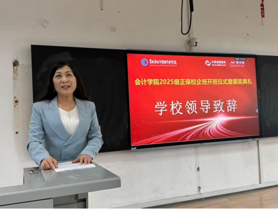 开班仪式上,会计学院院长林冬梅作为校方代表上台致辞。林院长首先向合作企业表达了感谢。她强调了会计学院始终将人才培养作为学院最根本的任务,坚持以深入推进产教融合和校企协同育人为工作核心。并寄予同学们三点期望:一是认识自已,从现在开始成长。只有做好考验耐心的小事、考验心态的难事与考验定力的大事,人生路才能越走越稳、越走越宽;二是认识大学,从现在开始觉醒。希望同学们拥有仁爱之心、能够忍受劳苦、力任各项品德、做到尽职尽责,让大学每一天的学习与生活都充满意义与方向;三是认识时代,从现在开始同频。大学生要与时代同频,要主动拥抱数字化与智能化,关注政策与法规的最新动态,坚持每日阅读行业资讯,每月复盘学习进度,培养跨学科视野,结合金融、供应链、信息技术等领域的知识,确保专业知识与监管环境同步。要真正成为能够在数字经济、可持续发展和全球化背景下提供价值的新时代会计人才。