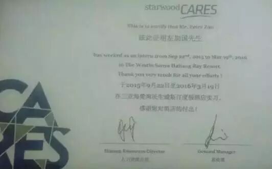 在三亚民生威斯汀度假酒店时,问我想去哪个部门 ?我说有没有既锻炼英语又辛苦的部门,他们说有—西餐。我为什么这样选择,因为我想学习英语和锻炼毅力。