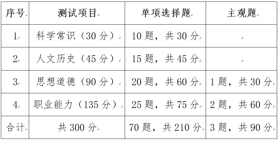 职业技能测试主要考查学生基本素质及职业能力。试题包含科学常识、人文历史、思想道德、职业能力四个模块。试题类型为客观题(单项选择题)及主观题(材料分析或论述)。