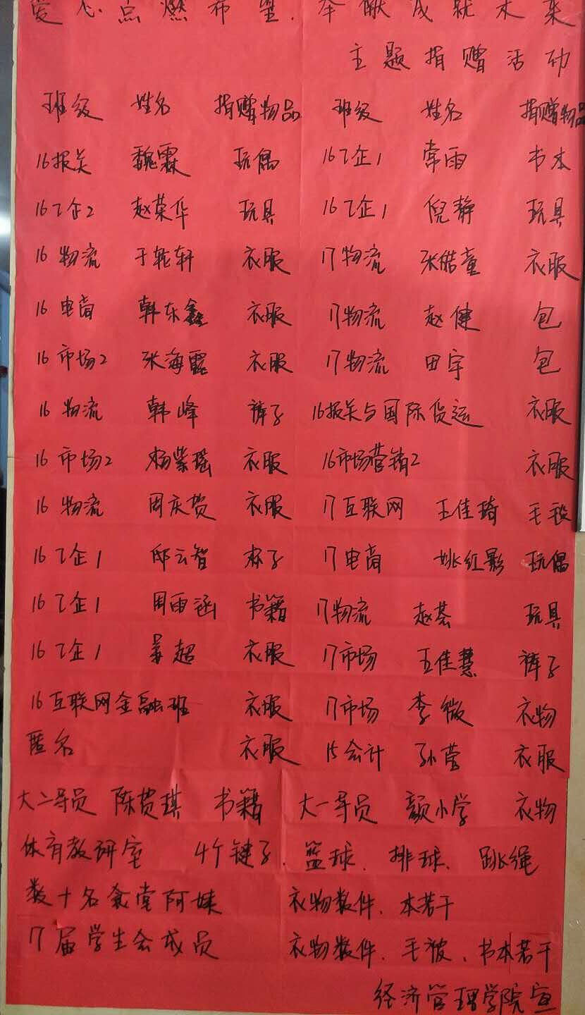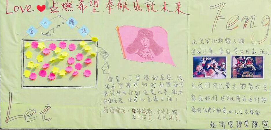 大力弘扬雷锋精神,进一步关爱贫困儿童的学习生活和身心健康,在那些孩子心中埋下一颗希望的种子,让梦想在孩子们的心中扎根发芽。助人为乐情长在,雷锋精神心永存。铁肩敢将道义担,经济管理学院学子用自己有限的能力,为社会创造着无限的温暖,用行动践行和传播着雷锋精神。壮大志愿者服务队伍,拓展志愿服务活动领域,延伸志愿服务活动内容,创新志愿服务形式,经管学子从未止步。