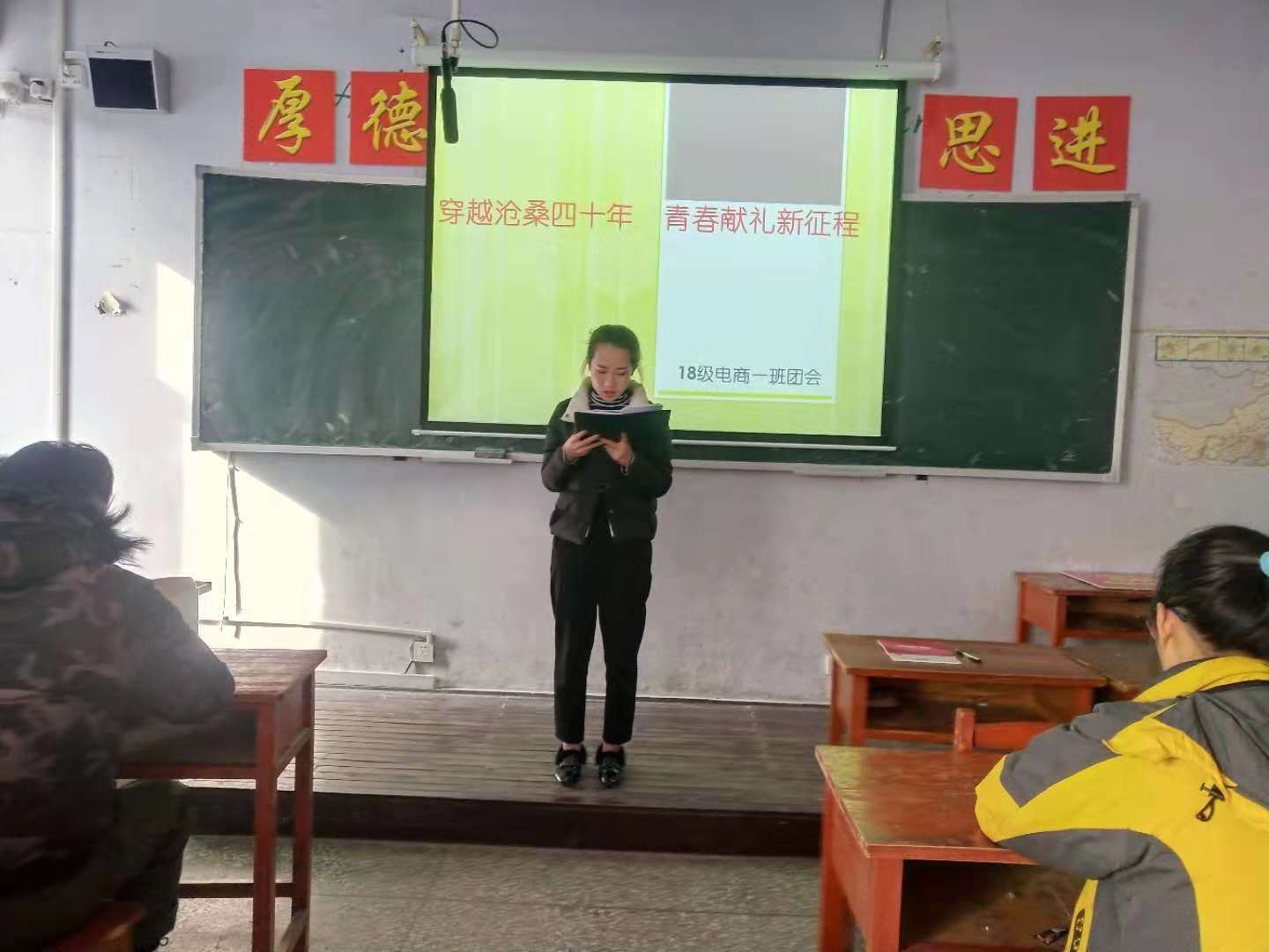 10月22日,2018级电子商务一班班在教室举行纪念改革开放四十周年团组织生活会。团支书向大家介绍了改革开放的背景,阐述了当年改革开放所面对的阻力与挑战,大家深刻领悟到了如今生活的富足幸福与当年领导人的筚路蓝缕和全国各族人民的奋斗是分不开的。在介绍改革开放获得的成就时,通过一幅幅过去和现在生活的图片对比,反映了翻天覆地的变化:代步工具的更新迭代,信息交流工具的日新月异,贴近民生政策的贯彻落实,让大家时时刻刻感受着“改革开放”这道春风给社会带来的积极影响。互动环节,同学们畅所欲言改革开放给他们家庭带来的变化:有的同学高兴地说道,家里的经济收入提高了,有的同学说到家里曾经的三轮车如今已变成了小轿车,住上了小洋房。