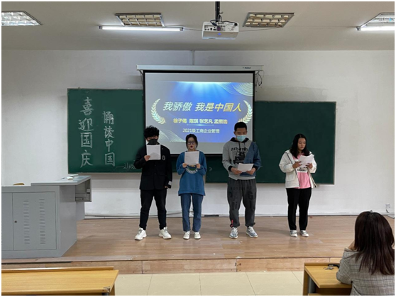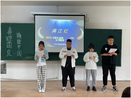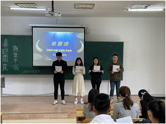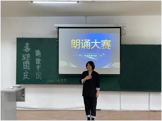 为了进一步弘扬中华民族文化精髓,落实立德树人根本任务,深化爱国主义教育,坚定理想信念和初心使命,丰富校园文化生活,推动校园文化建设,营造积极向上的校园氛围,增强学生的集体荣誉感。经济管理学院团总支学生会于2021年9月30日午时在院部A教学楼105教室开展了“喜迎国庆,诵读中国”主题诗朗诵活动。经济管理学院团总支书记李志新、2020级辅导员崔英女、2020级辅导员王心语、学生会主席田国良以及2021级助导参加本次活动。