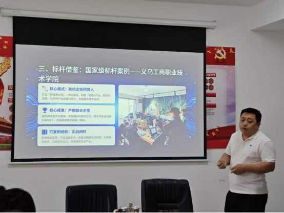 随后,双方就产教融合一体化建设实施方案展开逐点研讨,围绕“岗课赛证训培研学”一体化体系构建、订单式人才培养、“校中厂+厂中校”双实训基地建设、校企合作工坊运营、赛事赋能与地方产业服务等核心内容深入交换意见。经过充分交流,双方一致认可以岗位需求为导向、以能力培养为核心的基地建设方向,确立了“院校主导、校企协同、立德树人、长效共赢”的合作原则,同意成立专项联合工作组统筹推进后续合作事宜。院方与企业代表还就人才培养方案制定、实训场地规划、双师型师资队伍共建、学生实习就业保障等具体问题达成初步共识,明确了各阶段工作目标与具体推进步骤。