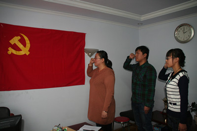 下午2点,大会在雄壮的国歌声中开始,通过自我介绍、培养介绍等环节,两名入党积极分子怀着无比激动的心情加入了中国共产党,成为中共预备党员。他们纷纷表示,一定不辜负党组织的培养和教育,在今后的学习、工作和生活中继续努力,奋勇向前。全体党员面向党旗,一侧站定,举起右拳,神情庄严,声音洪亮,重温入党誓词:“我志愿加入中国共产党,拥护党的纲领,遵守党的章程,履行党员义务,执行党的决定,严守党的纪律,保守党的秘密,对党忠诚,积极工作,为共产主义奋斗终身,随时准备为党和人民牺牲一切,永不叛党。”宣誓完毕之后,所有党员合影留念,以这种永恒的方式见证对党的一片赤诚。