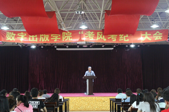 期末考试与英语等级考试即将来临,为严肃考风考纪,弘扬数字出版学院的优良学风,加强对学生的诚信教育,从根源上杜绝考试作弊现象,营造良好的学习和考试氛围,2015年6月10日下午4:30分,数字出版学院在前进校区礼堂召开了考风考纪教育大会。院长刘庆红教授,书记曹安富同志,副院长邓又明副教授,电子技术教研室徐冉老师,辅导员周晓迪老师、崔琳琳老师以及全院学生参加了此次大会。