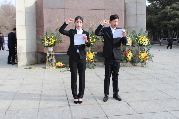 早上6点20分,祭扫活动正式开始。活动第一项学生代表郭犀群、张岩向死难烈士致词。活动第二项全体肃立默哀一分钟,深切缅怀战斗中牺牲的烈士们。活动第三项高举右拳,向烈士们的先烈遗志庄严宣誓,在场的每一位同学都深受教育和启发,并为祖国的繁荣富强而努力学习,共创更加辉煌的未来。活动结束后,师生们怀着崇敬的心情瞻仰了英雄纪念碑。