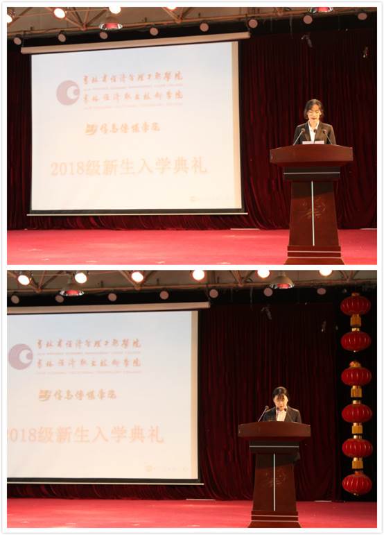 随后教师代表刘先花老师在讲话中对同学提出了在学校期间不同阶段的几点建议:引经据典,引用谢海龙讲的“爱心铸就希望,知识改变命运,梦想让我们成长,我们没有理由不珍惜当下的幸福生活”。优秀学生代表2017级唐磊同学把自己好的学习生活经验介绍给新同学,鼓励学弟、学妹们在注重学习的同时,要积极参加院内外的各种活动,特别是专业技能竞赛。接着新生代表2018级乔天天同学在发言中表示作为新生要养成一个良好习惯培养自己终身为理想积蓄力量的能力,并将勤奋刻苦,努力拼搏,不辜负老师们的殷切期望。