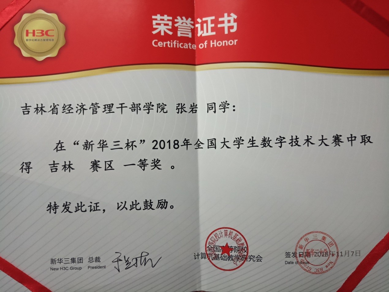 经过激烈的角逐,我院学生在本次比赛中喜获佳绩,有三名学生分获一二三等奖。由范晓春老师指导的17计算机应用技术专业的张岩同学荣获一等奖,并获得参加决赛的资格。本周末,张岩同学将前往浙江省杭州市代表我校参加2018年新华三杯数字技术大赛的决赛。