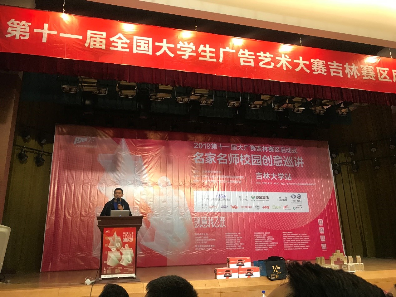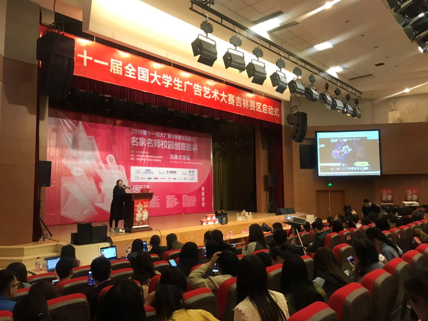 2019年4月23日下午13:00,第十一届全国大学生广告艺术大赛(简称:大广赛)吉林赛区启动式名家名师校园创意巡讲活动,在吉林大学南校区经信教学楼报告厅正式拉开帷幕。本届大广赛的主题为“创意我飞跃”,本次活动由全国大学生广告艺术大赛组委会主办,吉林大学新闻与传播学院承办。