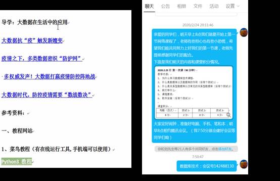 课上,老师各种平台切换使用,保证云端课堂不断线。学习通教学平台高峰时期卡顿现象严重,老师们将签到环节转到QQ群打卡或接龙,课堂讨论环节转到微信群或QQ群讨论,待平台运行稳定后,再将环节拉回到平台,保证后期数据的统计。优质视频分享,让学生们也听到了优质大学优秀老师的讲解。直播间里,老师和学生的在线互动如火如荼,丝毫不逊于现场教学,“听懂的同学回1”、“做完的同学发笑脸”、“某某同学分享你的屏幕”,“前*名同学有加分”、“某某同学说的非常好”、“某某同学理解的非常正确”、“某某组的观点是……”等等,老师积极调动学生,学生热情参与,虽然老师和学生、学生和学生相隔甚远,但却依然能够感受到那一幕幕和谐热闹的课堂情境。老师们边直播授课边录屏,课后将重要知识点的录屏上传致平台,方便学生课后回看复习。