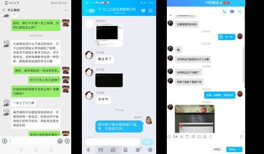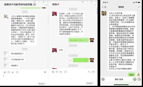 一天的教学结束后,老师们也都感悟颇多。大多怀着忐忑、激动的心情开启线上教学,但是随着学生的积极配合,所有的忐忑和顾虑都烟消云散,虽然会偶有卡顿或其他突发状况,但是都在老师和学生的共同努力下一一解决。课后老师们立刻在群里分享自己的授课经验,让其他同事去糟粕取精华,去己短取彼长,教学相长。