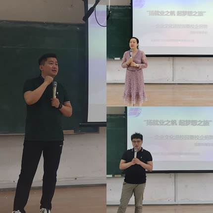 随后,汇丰达成有限公司人力资源经理刘岩介绍了公司情况以及新人的学徒制实习模式,岗位发展的机制以及公司薪资待遇,销售总监孙岳崧从加强学生职业素养的角度做了精彩发言,他从初入职场的实习生所常有的四种通病入手,介绍一个职业人应有的职业素养,以及如何开展大学的学习,做好就业的准备,还介绍了职业资格和企业认证对就业的辅助作用,鼓励同学们树立职业目标,并为实现高质量就业而努力,为同学们上了一场生动的职业素养课;最后网安公司总经理王巍赫为同学们介绍了招聘岗位以及相关的要求。现场同学们和王经理进行了互动。