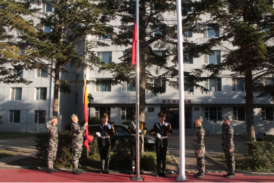 升旗仪式伊始,鲜艳的五星红旗在学院国旗护卫队的护送下缓缓入场。伴着雄壮的《义勇军进行曲》,五星红旗冉冉升起。秋风送爽,国旗飘扬,全体师生齐唱国歌。