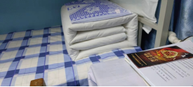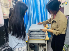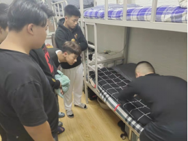 退伍兵学生和学生会干部利用课余休息时间,逐个新生宿舍指导内务,他们给同学强调,整理宿舍内务时物品摆放不一定要一样,但是一定要干净整洁。比如床铺上的被子要整齐地摆放在一侧,鞋子可以用鞋架整理,小物品可用收纳盒收置,东西由小到大排列放置等。指导叠军被环节,退伍兵学生干部挑选每个宿舍最难叠的被子进行分步骤演示,并将叠被子的关键步骤向同学们进行了详细的讲述,强调了叠军被的重点及动作要领,经过虚部掏平、压平、两次对折等步骤,“豆腐块”的大体形状便出现了,再经过“三分叠七分修”的工作之后,标准的军被便呈现在大家眼前,各宿舍响起新生们敬佩的掌声。通过退伍兵和学生干部的悉心指导,每个新生都熟练掌握被子叠放的标准和技巧。