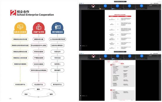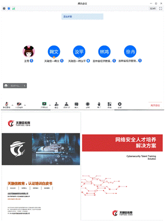 北京天融信教育科技有限公司相关负责人:项目经理韩汝平和项目经理鞠文参加了此次线上交流会。会议伊始,韩汝平经理介绍了天融信教育科技有限公司基本情况,主要对校企合作、职业认证培训和职业教育培训等方面进行了详细讲解,并对网络安全人才培养体系进行了深度交谈。本次与企业的线上交流主要讨论以下内容: