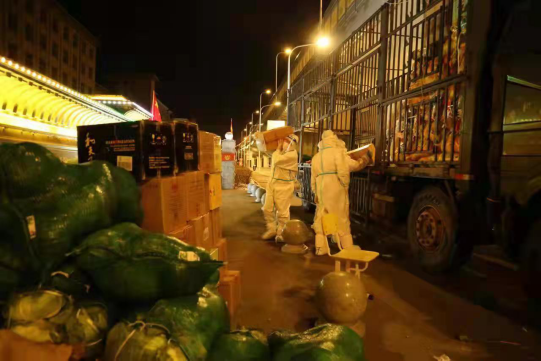 他们身穿白色防护服,将一箱箱、一袋袋沉重的蔬菜扛在肩上,抱在胸前,车上车下一趟又一趟,汗水湿透了他们的衣服,但他们一刻也没有停歇。搬卸工作持续4个多小时,大家累得瘫在地上……