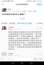 课程资源中的视频是网络教学的主要部分,代替了教师在课堂的讲授,那么教师只需要播放视频就可以了吗?这是《军事理论》课几位教师的思考。根据每节课内容的重难点,结合时事把一些弘扬爱国情怀的内容穿插在课程中,学生通过观看视频有所触动,设计讨论、抢答、评分、测验等教学活动或通过作业讨论的方式,促进学生深入思考,强化学生担当意识,提升自主学习能力,达到教育的目的。