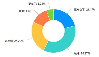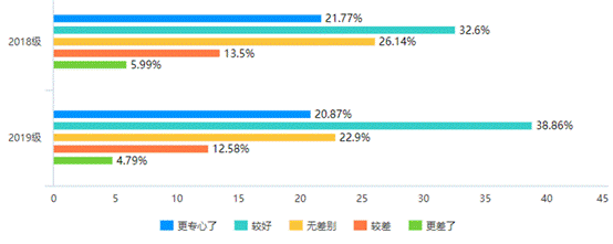 在学生的学习状态表现方面,相对于传统课堂,有57.54%的学生认为他们上网课时的专心程度较好、更专心;有24.22%的学生认为无差别。综合统计,80%以上的学生上网课的专心程度可与传统课堂等同,甚至更好。从各年级交叉对比数据得知,2019级学生专心程度好于2018级学生。