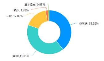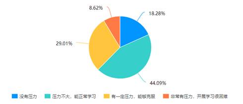 从学生反馈的学习压力情况来看,表示无压力或压力不大,能够正常学习的比例达62.37%,有压力但能够克服的近30%。但同时有8.62%的学生反馈非常有压力,学习困难,此部分学生,各分院、任课教师及辅导员需要特别关注。