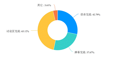 根据学生反馈结果,综合统计,90%以上的学生对于目前教师所采用的混合式网络教学呈现形式较为喜欢,另有8.69%的学生留言表示不喜欢网络教学,想要开学面授。在网络教学的互动交流方式上,相对于弹幕交流和语音交流,学生更喜欢讨论区交流,同时有27%的同学表示应增加交流频率和一对一交流机会,这也侧面反映了同学们想要主动学习态度。