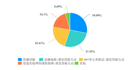 经学生反馈结果显示,网络教学平台中学习通使用率最高,占比97%,并同时与其他平台交叉使用。老师网络授课采取的方式主要为多种方式混合。在师生互动方面,通过综合统计,学生认为80%的课程师生互动比较多,但仍有近20%的课程师生互动一般,甚至没有,根据此数据,部分任课教师应加强有效的师生互动。