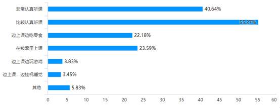 通过调查发现,虽然有95%以上的学生认为自己在上网课时学习比较认真,但也有近60%的学生偶尔在网络学习过程中会出现不同程度的如下行为,如吃零食、被窝里上课、玩游戏等。同时学生认为主要影响专心程度的因素有学习环境、老师教学能力、兴趣、自制力等。