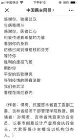 学院民盟支部主委谭梅教授,创作诗歌作品声援武汉,致敬援鄂一线抗“疫”勇士,诗颂英雄,祈盼援鄂医务工作者平安凯旋。原创诗歌作品《感谢你!》和《致武汉》发表于民盟吉林省委网站,其中一首《感谢你!》被民盟中央官方微信平台转载。