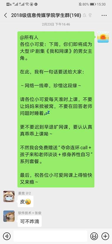 抓好考勤,网课就胜利了一半,学生干部和辅导员齐上阵,夺命连环call打给赖床的小可爱,确保课堂出勤率,取得阶段性小利。但绝不骄傲,因为每天都要坚持当人肉闹钟呦~