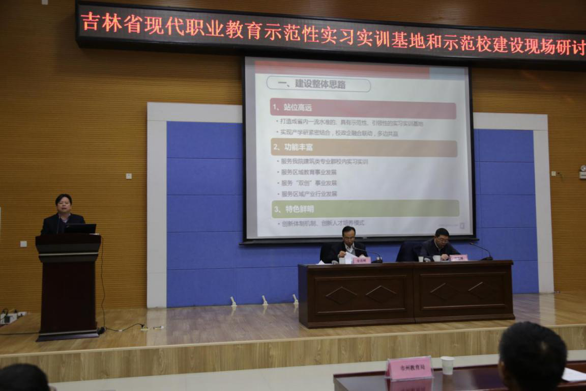 为推进吉林省现代职业教育示范性实习实训基地和示范校建设,理清建设思路、强化建设特色、保证建设质量,吉林省教育厅职业与成人教育处于11月16日上午,在长春市机械工业学校召开了现代职业教育示范性实习实训基地和示范校建设现场研讨会。会议由吉林省教育厅职成处宋春辉处长主持,期间,第一批示范基地建设单位代表进行汇报发言,我院胡伯龙副院长就我院建筑类专业示范性实习实训基地的建设整体思路、基地基本情况、基地基本功能、基地体制机制及启示与建议五个方面,进行了汇报,得到了与会人员的一致好评。战高峰副厅长最后做总结发言。