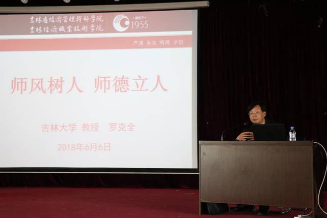 按照总体计划安排,2018年6月6日下午,我院“2018年教师教育教学素质能力提升培训班(第一期)”第一次培训在前进校区六楼会议室顺利举行,186名教师参加了培训。会议由胡伯龙副院长主持,孙杰光院长到会发表讲话,并由吉林大学罗克全教授进行了题为“师风树人,师德立人”的专题讲座。
