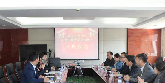 2018年4月25日,经济管理学院在院部办公楼三楼会议室举行苏宁现代学徒制班开班典礼,吉林省经济管理干部学院副院长胡伯龙、长春苏宁销售有限公司副总经理胡颖出席了会议。参加会议的还有招生就业处处长元克、学生工作处副处长张景成、经济管理学院有关领导及长春苏宁销售有限公司人力资源总监丁辉、O2O融合推进部经理刘月红、校园部经理喻晨等。学徒制班指导教师及全体学员参加了开班典礼。