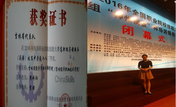 本项赛事设有普通话导游服务和英语导游服务两个赛项,分自选导游讲解、抽选项目讲解、现场知识问答、导游职业能力测试、才艺展示五个部分进行比赛。文化旅游学院周娇阳同学通过吉林省职业院校导游服务技能大赛获一等奖,获得了参加国家比赛的资格,在不到一个月的时间里,刻苦学习,完成2000多道题目,20个抽选景点和才艺等内容的准备。经过激烈角逐,由李娌老师指导的周娇阳同学荣获三等奖。