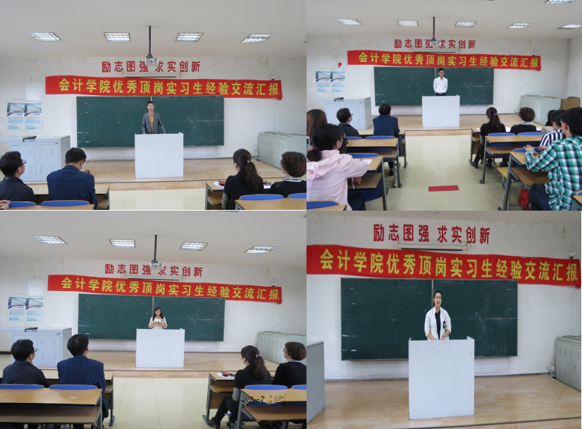 2016年5月11日中午12点,会计学院2016届毕业生顶岗实习经验汇报会在A教205教室隆重举行。参加本次汇报会的有:会计学院院长李昕教授、党总支书记付杰、副院长林冬梅、党总支副书记南洪吉、会“技”协会全体会员和大二的学生代表。汇报会由副院长林冬梅主持,来自万通药业的王鑫、来自修正药业的沙金涛、来自畅捷通公司的杨乐以及自主创业的刘亚男四位同学在汇报会上发言。他们在顶岗实习中分别尝试过销售、行政管理、会计以及社会服务等不同的岗位,通过个人的努力、领导的培养和岗位环境的历练,已经成长为单位中能够独挡一面的骨干力量。特别是杨乐同学以“一个普通女孩破茧成蝶的蜕变”为题,向大家展现了一个身体残疾但内心坚强的阳光女孩的成长历程。汇报人的精彩发言赢得了与会者一次次热烈的掌声。他们洋溢在脸上的笑容、融化在骨子里的自信、言语间流露出的从容与坚定,深深地感染着到会的每一个人。
