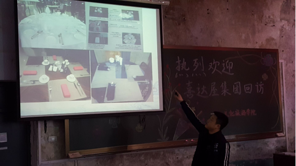 下午,何欢欢经理与王飞飞总监前往和平校区对我院14级酒店管理专业学生进行回访。两位经理从三亚千里迢迢前来看望实习生,受到了学生们的热烈欢迎。回访会从同学们精心准备的宣传片开始,一张张照片将大家的思绪带回了“碧海蓝天”的三亚。随后,四位同学分享了六个月实习生活带给大家的欢乐和成长。左家国同学还特意制作了PPT,这位男同学将实习前在校学习的“中餐摆台实训课”拍下的照片,与在三亚酒店工作中的看到的摆台照片组合在一起,还进行了“对比说明”。他说:“在校期间我学到的摆台与企业有相同与也有不同。相同的是餐具之间都有“1厘米”的严格标准,而不同的是地域文化差异,使摆台的形式发生了很大的变化。”李泽世同学在福朋酒店实习,他的发言稿一共写了整整三页纸。六个月的时间教会了他严谨做事、认真完成每一项工作,由于实习表现优异,三亚福朋酒店将唯一的优秀实习生奖颁发给了这位男同学。