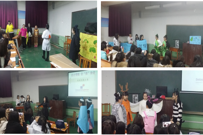 12月28日17:00点在和平校区,会计学院会“技”协会各项比赛在307教室拉开帷幕,会计学院副院长即会计人社团教练林冬梅、ERP社团教练赵金燕、金算盘社团教练侯雁和张萌、金手指社团教练辛悦、WE社团教练张开宇担任本次各项比赛的评委。首先在307教室陆续进行了传票翻打比赛、WE比赛、点钞比赛,选手们个个专业技能扎实,实力不相上下,整个比赛过程紧张而又精彩。最后一个赛项是会“技”协会首届DI创新思维比赛,在一楼阶梯教室开赛,本次参加DI比赛决赛的总计6支队伍,分别来自金手指社团、金算盘社团、会计人社团、CA社团和、ERP社团,虽首次参加DI比赛,但参赛队员认真研读六个挑战题目,分别选择了伪装大师、米姆活动、音乐混搭三个挑战题目,从剧本创作与排练到道具制作,经过一个月的推敲、修改与磨合,比赛中都表现很出色。DI(Destination Imagination)中文翻译为“目的地的想象”,是给参赛者设置一个“目的地”,由参赛者自己设计活动方案、设计情节、制作工具、七人一组(最多),齐心合力共同完成设计的目标。竞赛题目由美国资深的教育专家设计,它为学生提供了广阔的想象和创造的空间,解题方案可以是多种多样,要求参赛者的创意要新、奇、特,因此没有统一的标准答案,标准就是“没有最好,只有更好”。同学们在传递正能量、发挥想象力、解决问题的同时呈现了精彩的表演,赢得现场的阵阵掌声与笑声。