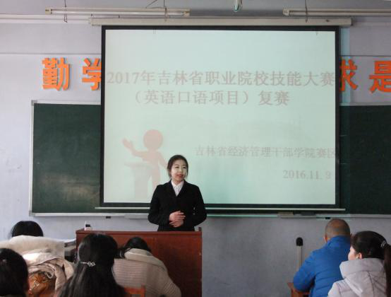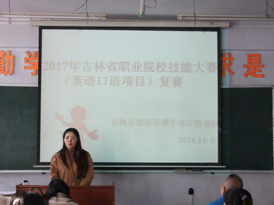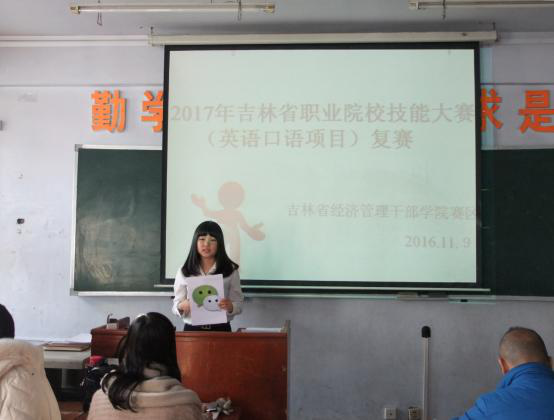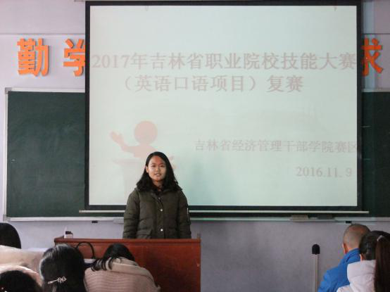 11月9日下午1:30分,2017年吉林省职业院校技能大赛(英语口语项目)吉林省经济管理干部学院赛区复赛在院部B教304教室举行。十五名参赛选手同场竞技,均表现出了各自的超高水平。最终,来自经济管理学院2015级工商管理专业的孙鹏同学获得了本次比赛的第一名!