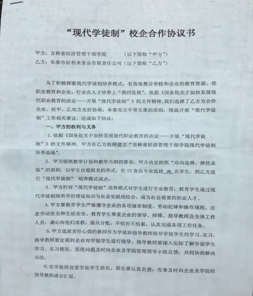 为推行产教融合的职业教育模式,打通和拓宽专业技能人才培养成长通道,坚持面向市场、服务发展、促进就业的办学方向,现代农业学院与长春市好利来食品有限责任公司达成“现代学徒制”合作意向,并签订了校企合作协议书。经过前期研讨、中期选拔、后期推进三阶段工作,首批“现代学徒制”的学生们向好利来集团“起航”。