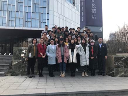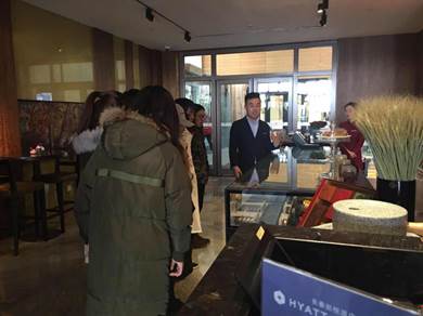 让同学们兴奋的是,在凯悦酒店里,接待大家的中餐厅经理、西餐厅主管都是我们学院毕业的学长,还有正在岗位上忙碌的“15级学徒班”学姐。在福朋喜来登酒店,从大堂接待到酒廊、宴会厅,3位领班是刚刚从我院毕业的14级酒店管理专业“福朋订单班”的学长。“榜样的力量”是无穷的,许多同学还与学长们交换了微信联系方式。 从“订单班”到“学徒制”,从“传统课堂”到“企业课堂”,每一步的推进和改革都需要校企双方共同努力,构建校企共同育人的教学管理和运行机制十分重要,文化旅游学院一直积极探索人才培养的有效模式,为培养实践能力强、职业素养好的高技术技能型人才而努力。参观在教务处和车队的协调与配合下,同学们圆满的完成了实践教学活动。