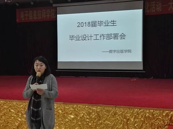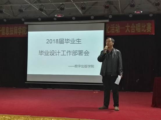 会议由辅导员薛静老师主持,分院副院长邓老师做了毕业设计工作部署讲话。邓老师首先强调了毕业设计的重要性,要求同学们高度重视起来,然后讲解了毕业设计形式,并就毕业设计指导工作的具体时间安排进行了讲解,重点强调了学生在11周离校实习前务必按照通告的指导教师联系方式联系自己的指导教师,并与指导教师见面,完成毕业设计开题工作。然后按《数字出版学院关于2015级学生毕业设计的工作安排》中的要求与指导教师保持紧密联系,按时完成毕业设计各个阶段任务。最后,总支书记孙老师讲话,要求同学们在实习的同时保质保量完成毕业设计任务。