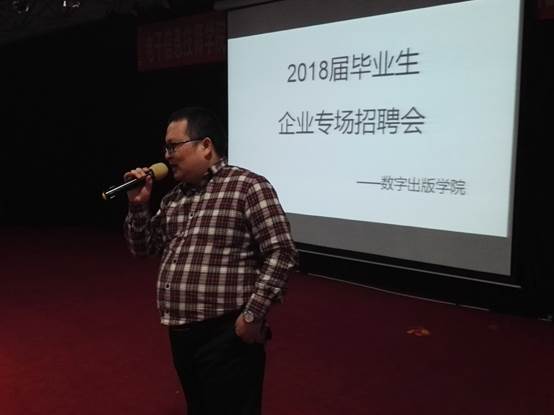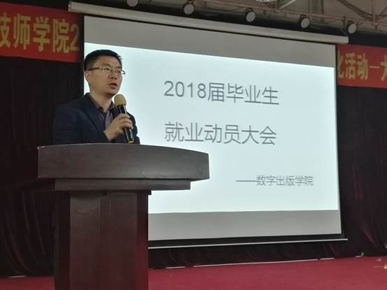 2017年10月27日下午,数字出版学院在前进校区六楼报告厅召开2018届毕业生就业动员会,会议由分院2015级辅导员薛静主持。学院招生就业处陈军老师,分院党总支书记孙成雨,副院长邓又明以及2015级学生全体参加了本次会议。