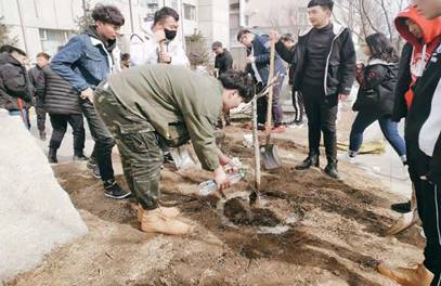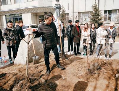 活动开始,同学们在刘庆老师的带领下分工协作,搬运材料、挖坑、栽树、盖土、浇水,每道工序都有条不紊的进行。对于大部分同学来说都是第一次种树,大家额头挂上了汗珠,身上沾满了尘土,但脸上洋溢着收获的喜悦。