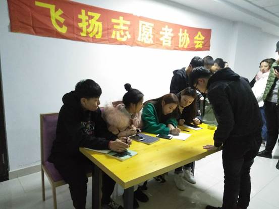 此次活动前期通过微信、QQ等网络平台在校内进行了大量宣传,很多学生积极踊跃地响应号召。下午16时50分,活动现场人头涌动,飞扬志愿者协会负责人王利佳带领全体协会成员布置活动现场,维持现场秩序。