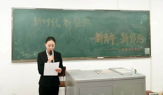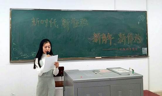 此次活动分成演讲组和朗诵组进行。下午16时20分,团总支、学生会全体成员及各班学生代表穿着整齐的在307教室等候着活动开始,首先由团总支副书记郎佳靖向学生介绍关于十九大报告中有关青年学生的重点内容,接下来各班派出的优秀学生代表纷纷上台进行演讲和朗诵。