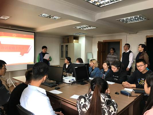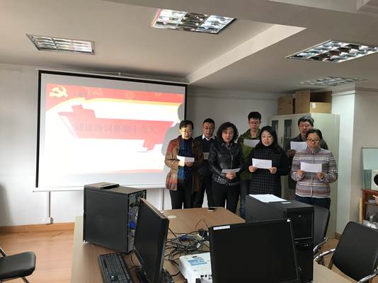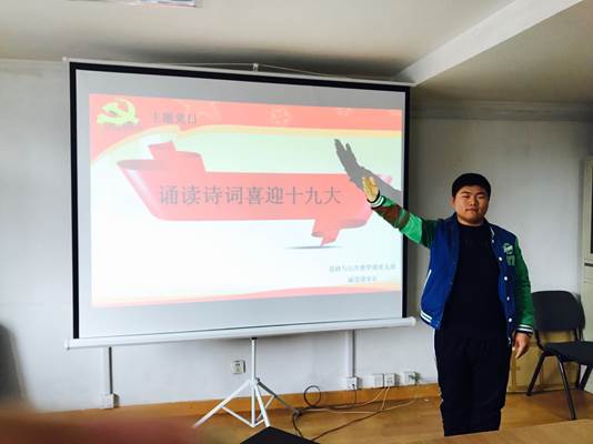 为迎接党的十九大胜利召开,思政部与公共教学部党支部及“诚道国学社”联合组织诵读诗词喜迎十九大活动。思政与公共教学部党支部部分党员教师及“诚道国学社”社员16级电子商务班杨金灿等同学参加诵读活动。诵作品为“诚道国学社”指导教师白洪魁创作的《迎接十九大诗词四首》。