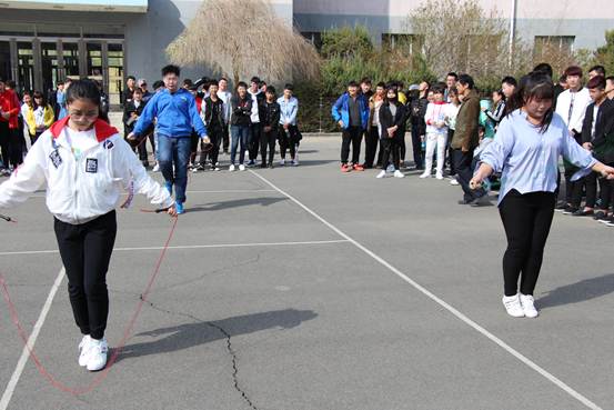 下午1:00在篮球场地上,王书记宣布了比赛活动的程序和要求,随着学生科长张哲夫老师比赛口令的开始,比赛场地呈现出一片欢腾的景象,彩绳飞舞,选手们龙腾虎跃,奋勇争先,力争上游。有的学生虽然动作笨拙却坚持不懈,赢得了一阵阵的掌声;有的同学动作完美,技巧娴熟,配合默契,速度飞快,看得观众眼睛都不敢眨一下,同学们参与比赛的拼搏精神和跳绳技巧赢得了场外同学们的阵阵喝彩。