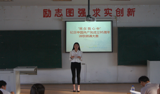 随着主持人展佳霞同学热情洋溢的开场白,诗歌朗诵大赛拉开了帷幕。在委婉动人的背景音乐声中,参赛选手们,把对祖国、对党的深情,倾注在一首首充满情感的诗歌中。比赛中,一首首慷慨激昂的红色经典和一首首耳熟能详的革命诗词再度唤起人们心中那段永不磨灭的记忆。选手们个个精神饱满,时而和风细雨,时而豪迈奔放,深情的诵读,抒发着忠坚不渝的红色情怀,热情讴歌我们伟大的党。
