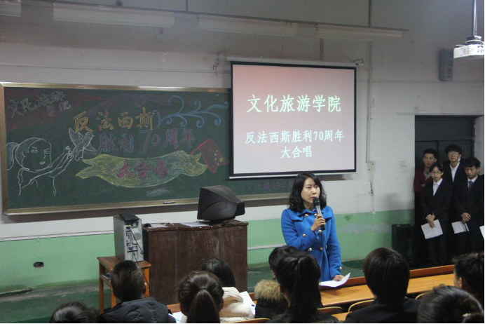 为弘扬抗战精神,培养学生爱国情怀,营造良好的校园文化氛围,2015年11月12日,文化旅游学院团总支在和平校区第三多媒体教室,举行了“勿忘国耻、圆梦中华”主题活动之纪念中国人民抗日战争暨世界反法西斯战争胜利70周年大合唱比赛。