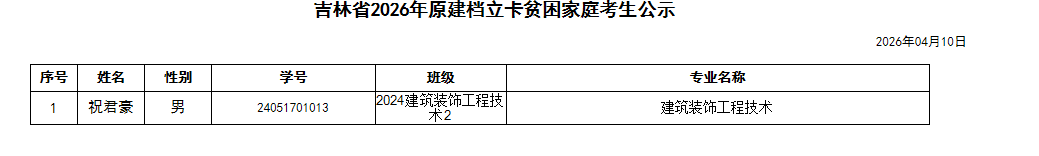 根据吉林省教育考试院《关于做好吉林省2026年普通高等学校专升本考试招生工作的通知》(吉教考〔2026〕12号)文件要求,经考生个人申请,分院初审,学院学生工作部(处)复审,祝君豪同学符合原建档立卡贫困家庭考生照顾加分资格。现进行公示,具体信息如下: